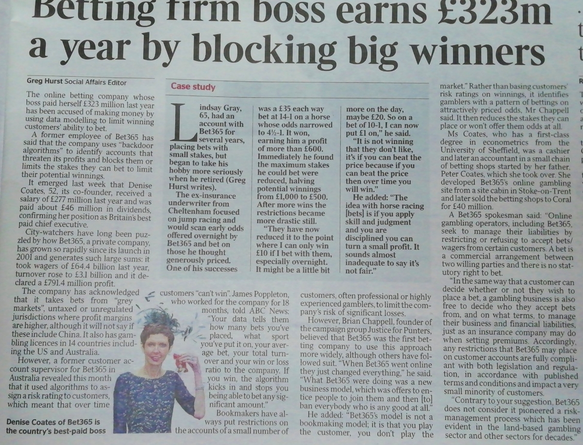 It's nothing new, but the topic of bookie restrictions flared up again yesterday with an article in The Times about Bet365's temerity to make money "by using data modelling to limit winning customers' ability to bet".